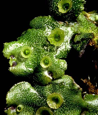 5. 例如「地錢」就能夠無性生殖,它配子體像葉子的表面上,有杯狀的結構,會產生一種特殊的細胞,稱為「無性芽gemmae」。雨水下到這些杯狀結構,沖刷無性芽,無性芽就會長成新的配子體植物。